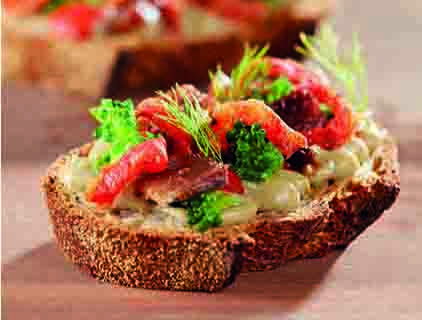 Bruschetta di pane pugliese con crema di melanzane, acciughe del Mar Cantabrico, pomodori e broccoletti
