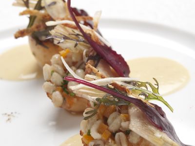 Versare una goccia di salsa yogurt in ogni piatto e sbriciolarvi sopra una noce. Tracciare tre punti con la crema di orzo e adagiarvi sopra le cappesante cotte in padella con olio, burro, sale e pepe. Su ogni cappesanta, collocare l’orzo e la pancetta croccante, più le foglie e le fette di carciofo condite con l’olio di nocciola e il sale. Nella tazzina sifonare il caramello e completare con la schiuma di cacao.