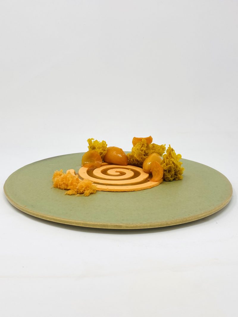 Mettere al centro del piatto la panna cotta, riempire le parti vuote con il caramello alle carote. Successivamente su un lato della spirale alternare in modo armonioso spugne, muosse e pinzimonio concludere dal lato opposto con la granita di carote.