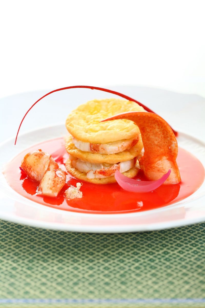 Montare la millefoglie con l’astice e disporre accanto la polpa delle chele.