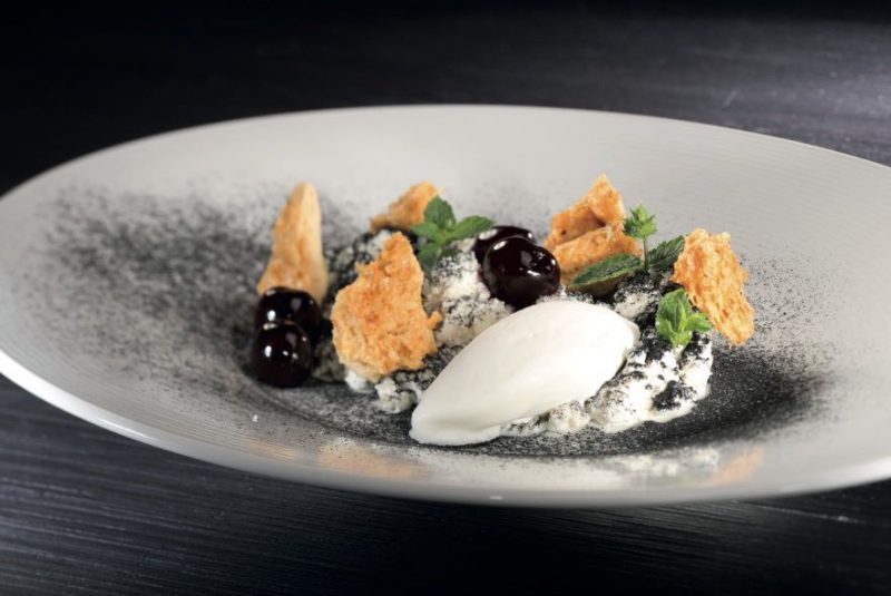 In un piatto, schiacciare la ricotta (circa 50 g a porzione) e spolverarla con il carbone. Aggiungere una quenelle di gelato fiordilatte, la roccia oro e le amarene (3-4 a porzione). Decorare con la menta fresca.
