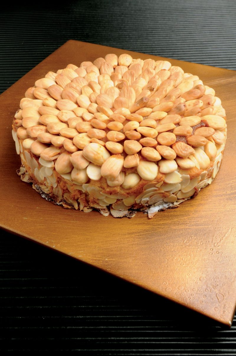 Amalgamare il tutto fino ad avere un composto omogeneo. In precedenza è stato preparato un classico pan di spagna: tagliarlo al centro, imbeverlo con del liquore all’arancio, inserire l’impasto del ripieno e chiudere con il pan di spagna. Con l’aiuto di un sacchetto con bocchetta liscia rivestire la torta con l’impasto di mandorla. Bagnare la torta con dell’acqua e lisciarla con un coltello. Ultimare la torta con mandorle intere sopra e mandorle a foglia all’esterno. Inforniamo a 170 °C per 40 minuti circa.