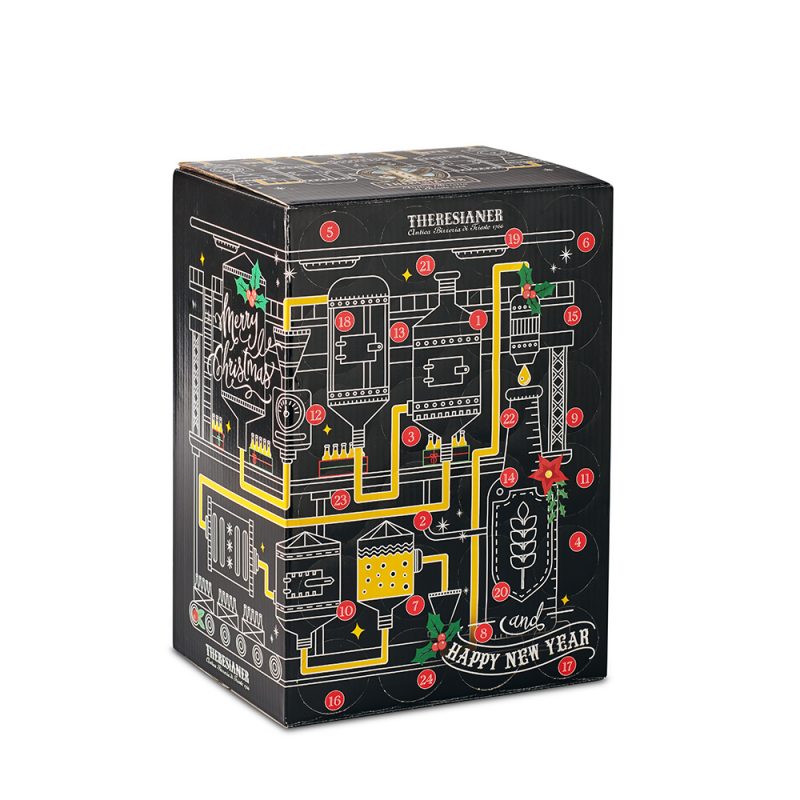 Il nuovo Calendario dell’Avvento Theresianer, dallo stile personale ed originale, accompagna lungo un percorso grazie alle magiche caselle da aprire giorno per giorno, che nella tradizione segnano il conto alla rovescia sino alla notte del 24 dicembre. La scatola è una fantasiosa riproduzione illustrata della fabbrica della birra: il percorso che, con la sapiente combinazione delle materie prime, porta alla magica alchimia della fermentazione e all’imbottigliamento.